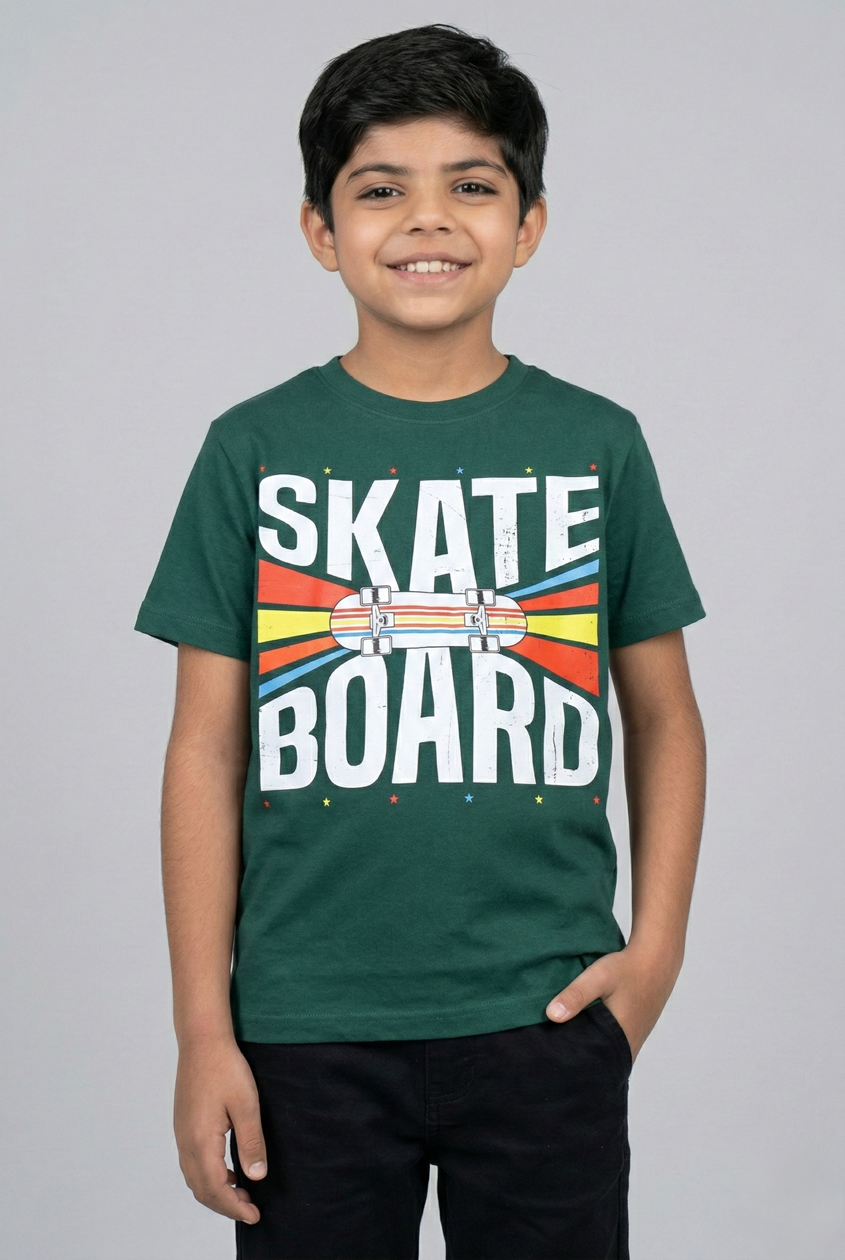| Designed for kids who love action and adventure, this Skateboard T-shirt showcases a vibrant graphic with a sporty touch. The comfortable fit and durable stitching make it perfect for school, playtime, and outdoor activities. |